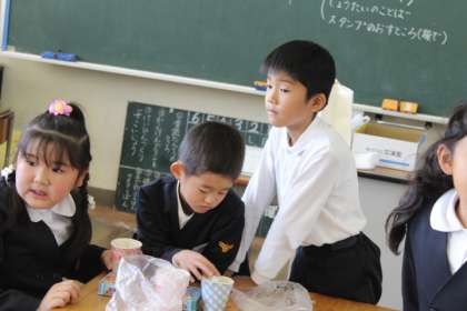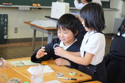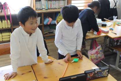 今、生活科の時間に、11月16日に行う「おもちゃランド」の準備をしています。子どもたちは、「わなげグループ」「とことこ車グループ」「魚つりグループ」「風せんロケットグループ」の4グループに分かれ、おもちゃを作り始めました。