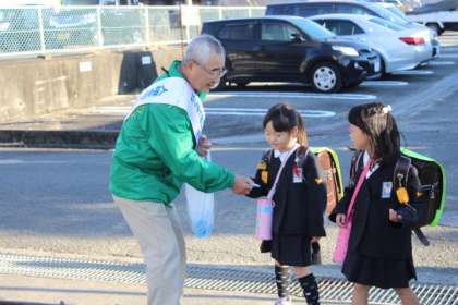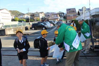 登校時の児童生徒一人ひとりに声をかけながら、ノック式の消しゴムを配布して、同和運動の推進を図る街頭啓発をして頂きました。