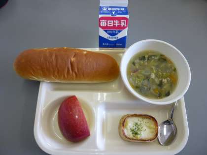 今日の給食の献立は、オレンジパン・グラタン・具だくさんスープ・りんご・牛乳です。ごちそうさまでした。
