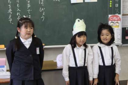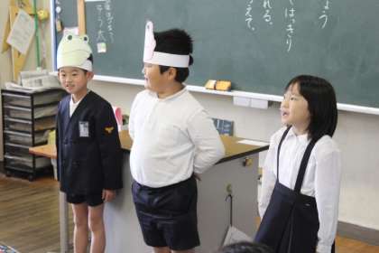 かえるくん、がまくん、ナレーターの役に分担をして、お面をつけながら、発表しました。
