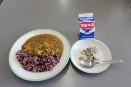 柿とひね鳥のカレーライス・ゆかり和え・牛乳です。ごちそうさまでした。