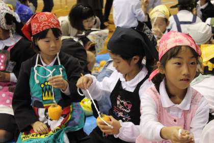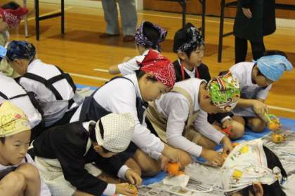 ピーラーで柿の皮むきをしました。手を切らないように真剣に皮むきをしています。「皮をむくのは、固かったけれど楽しかった。」と、みんな一生懸命に取り組んでいました。