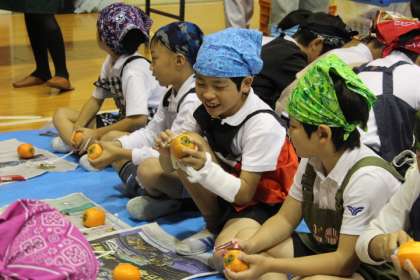 その後、柿をひもにつけました。説明をしっかり聞いて、お家の人や、指導員さんに手伝ってもらい、上手にひもに結んでいました。