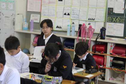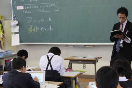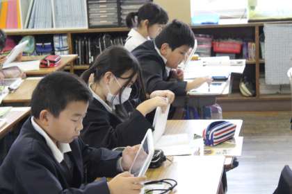 自動車会社は、これからどのような車を作ろうとしているのか。大きく2つあります。それは、人に やさしい車と環境にやさしい車です。各自動車会社は、いろいろな工夫をしています。今日は、それをタブレットを使って調べ学習をしました。「ハイブリットカーって何?」「車いすに乗ったまま 乗ることができる車もあるんや!」など、いろいろな発見がありました。
