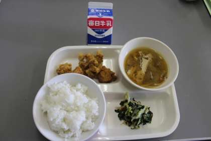 今日の給食の献立は、ご飯・鶏肉の梅酢揚げ・磯香和え・根菜汁・牛乳です。鶏肉の梅酢揚げは、梅酢で下味をつけてくださっています。ごちそうさまでした。