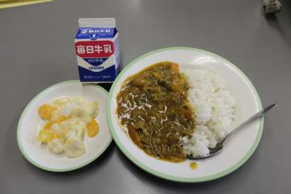 冬至のカレーライス・ナタデココ入りフルーツヨーグルト・牛乳です。