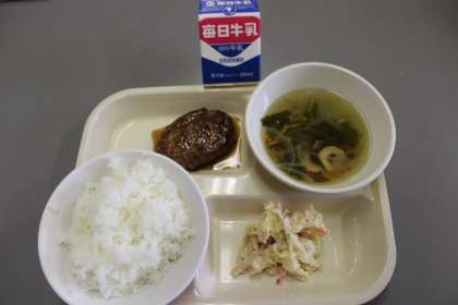 今日の給食の献立は、ご飯・ハンバーグ照り焼きソース・ポテトサラダ・コンソメスープ・牛乳です。ごちそうさまでした。