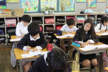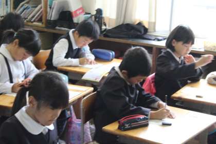 ドリルを見て、とめ、はね、はらいに気を付け、みんな丁寧に書いています。