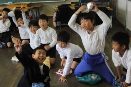 マラソンの後、みんな頑張ったので、給食だったら牛乳で乾杯をするのですが、今日はおにぎりの日。ということで、おにぎりで「乾杯」をしました。