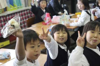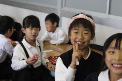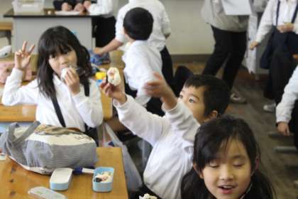 笑顔いっぱいで、おにぎりをほおばっていました。