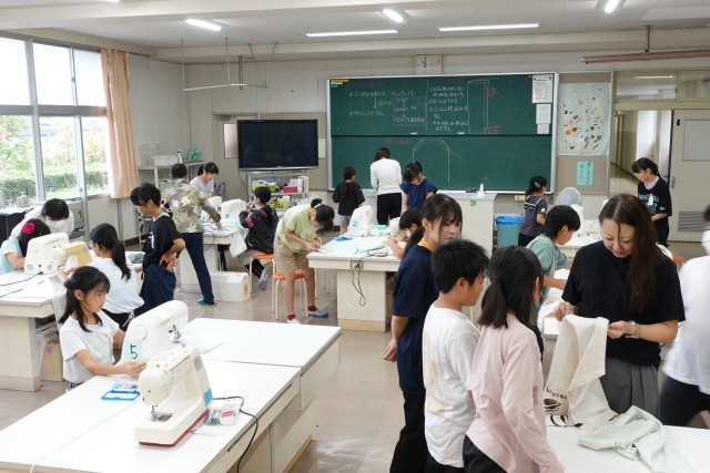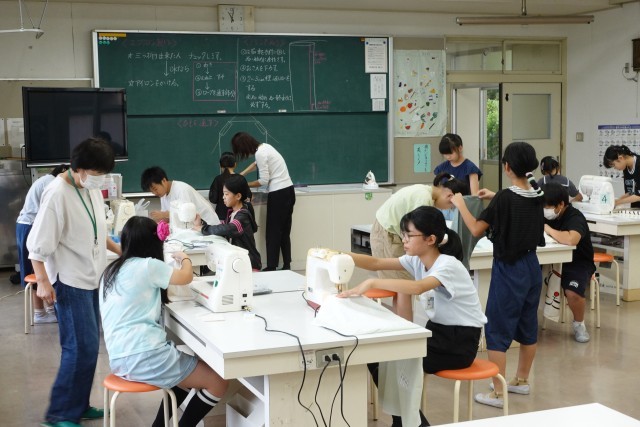 5Bの家庭科の時間です。ミシンボランティアのみなさんにサポートしていただきながら、エプロンづくりに励んでいます。ずっと使えるものです。完成まで努力を惜しまずがんばりましょう!