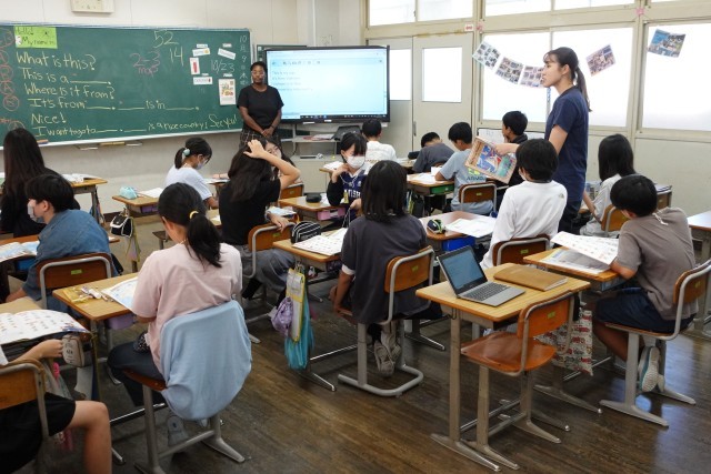中:6B 外国語 ペアになって会話をしていました。どこかの国の出身になりきって、出身国や食べ物などについて質問しあっていました。
