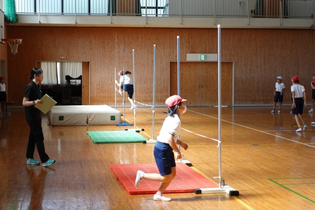 下:5A 体育 走り高跳びの練習です。バーのかわりにゴム紐を使って練習です。痛くないので思い切って跳べますし、バーが落ちることがないのでどんどん練習できます。
