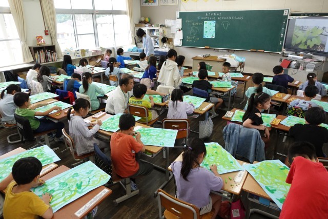 上:1A 図工 昨日練習した絵も、今日から本番です。どの子も上手に蔓が描けています。蔓を描いた上にアサガオの葉を描きます。そして、最後に花を貼り付けて完成です。みなさんいい感じに描けていますよ!完成が楽しみです♪