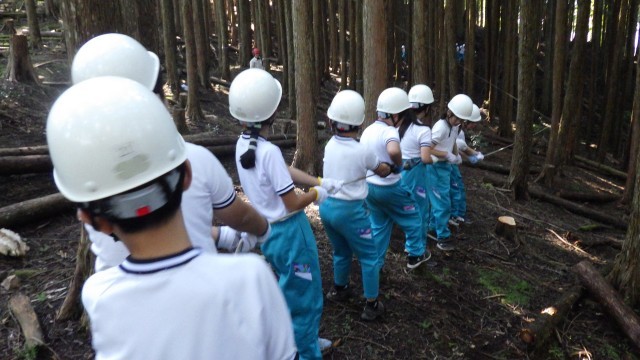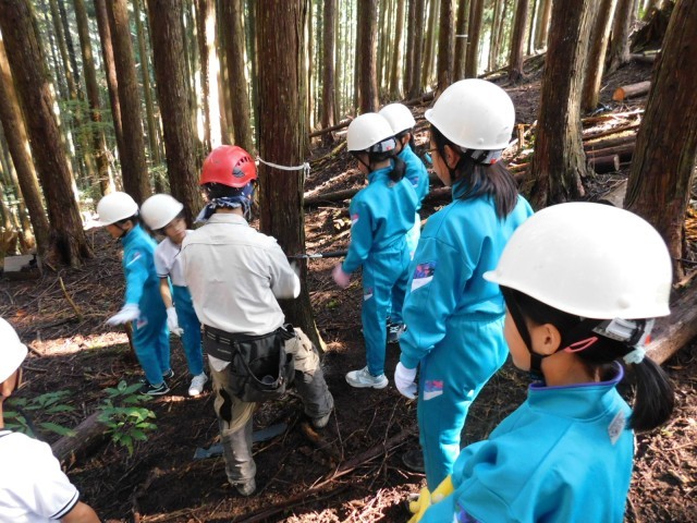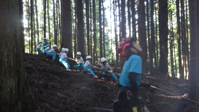 間伐体験では、のこぎりを使って懸命に木を切ったり、ロープを使って心を一つにして引っ張ったりして木を切り倒す活動を行いました。