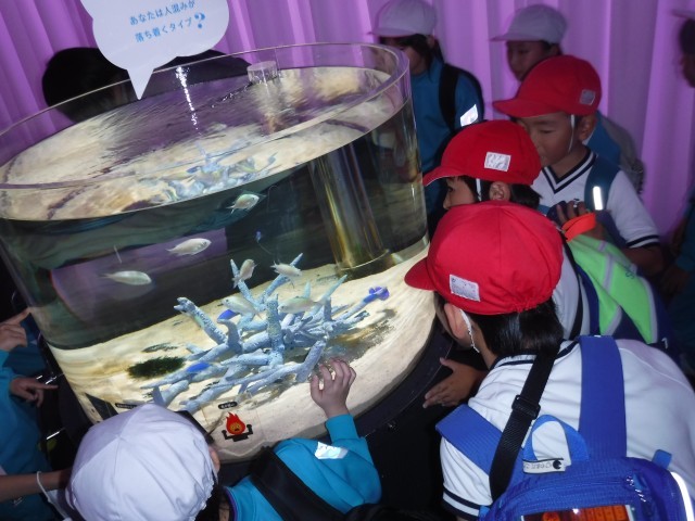 さまざまな生き物を間近で見たり、水槽の中をのぞきこんだりしながら