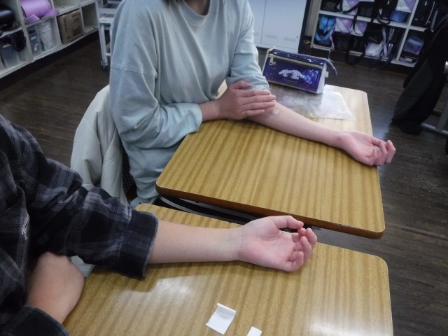 子供たちが1番盛り上がっていたのは、アルコールパッチテストです。絆創膏にアルコールをつけて7分間腕にはり、自分の体にはアルコールを分解する力がどれだけあるかを調べる活動です。お互いに絆創膏を貼っていた腕を見比べていました。