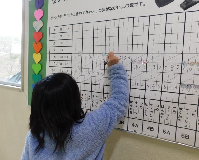 ぬきうちで!せいけつ調べ 公開日 2026/02/06 更新日 2026/02/05 保健室より 2月5日(木) 今日、1・2・3年生とE組の教室で、ぬきうちのせいけつ調べをしました。 ぬきうちにもかかわらず、1Aと2Bは、つめの長い人が0人! E組は、ティッシュ忘れが0人! という良い結果 ‼ しかし、全体的には「はんかち」「ティッシュ」を持ってきていない人が多い傾向でした。 忘れてた人は、「はんかち」「ティッシュ」の用意を! つめが長い人は、もちろん「つめきり」をお願いします。