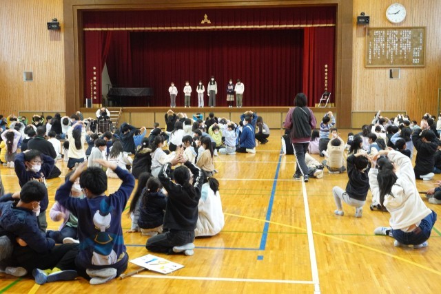 この日の5時間目に三石小のオリジナルキャラクター「ミッシー」の誕生を祝う会として全校遊びを行いました。