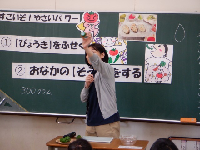 「やさいパワーを見つけよう!」をテーマに、野菜が体を元気にしたり、病気から守ったりする働きがあることを教えていただきました。子どもたちは興味をもって話を聞いていました。また、野菜をしっかり食べることの大切さや、給食の献立表にも野菜のことが書いてあることを知りました。授業後には、「少し食べてみたい」「がんばって食べてみる」など、自分の生活につなげて考える姿が見られました。