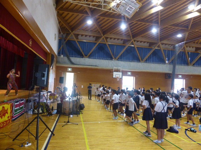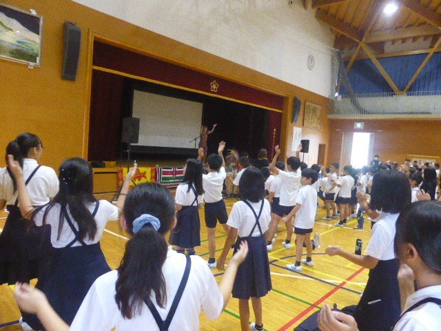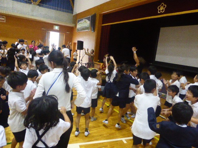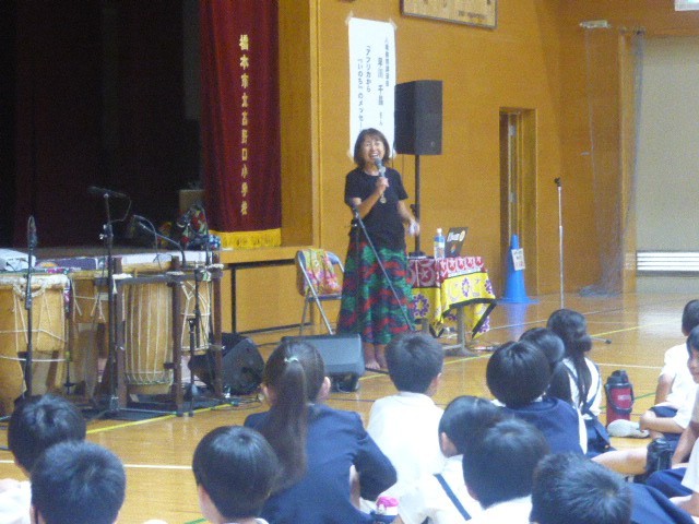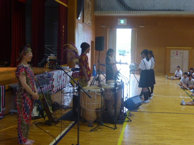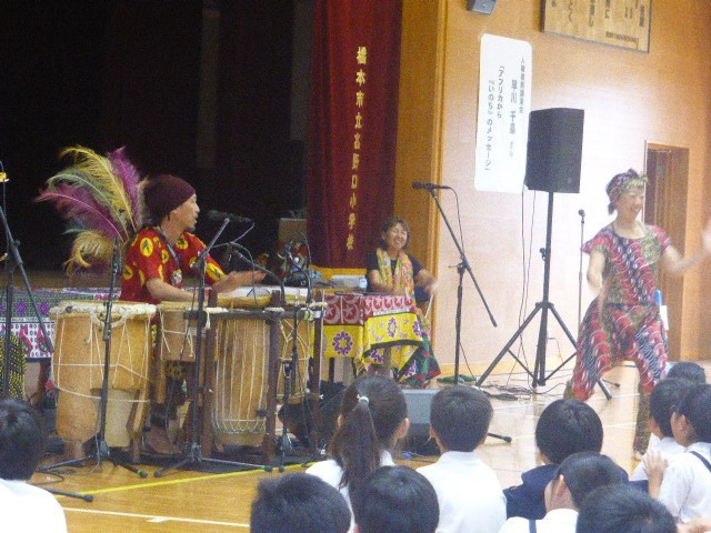 早川千晶さんとポレポレのみなさんがアフリカのケニアから高野口小学校に来てくれました。1部ではアフリカの動物のお話から始まり、スラムの生活の様子やそこでの活動について1年生から6年生までが分かるように伝えてくださいました。2部ではアフリカの太鼓とダンスを披露いただき、みんなで一緒に楽しく踊ったり歌ったりとてもウェルビーイングな時間を過ごすことができました。児童の感想です。「私たちにとって学校があって通えることは当たり前ですが、ケニアにはそれができない子どもたちがいっぱいいると知りました。私たちはただでさえ恵まれているのにネガティブで恵まれていない子がポジィティブなのはすごいと思いました。私たちの周りにもある音楽で元気になったり楽しくなるのはいいなと思ったので、私もそうなりたいです。ありがとうございました」