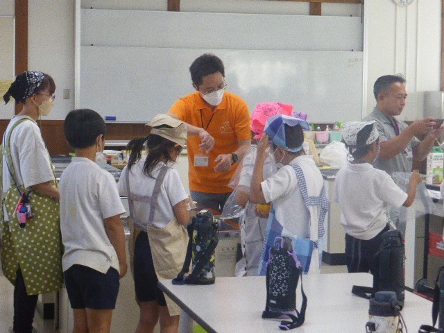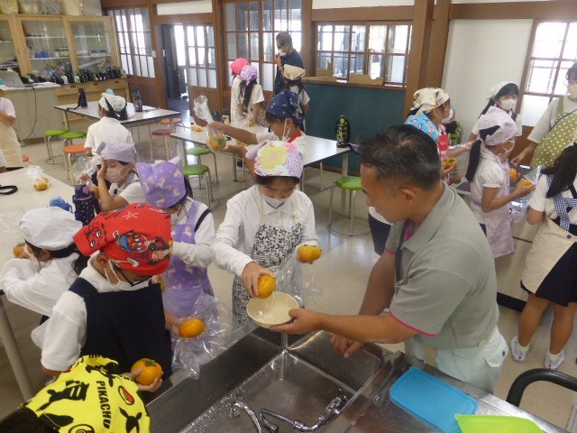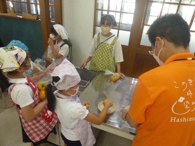 3年生は橋本市の名産である柿の渋抜き体験をしました。普段甘い柿しか食べていない子どもたちだと思います。渋柿という種類の柿があることを初めて知った児童も多かったようです。渋を抜く前と後の違いを実際に確かめました。渋柿の渋が抜けることが不思議ですね。5日ほどで甘くなるようです。お家の人にも説明できるといいですね。