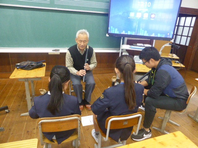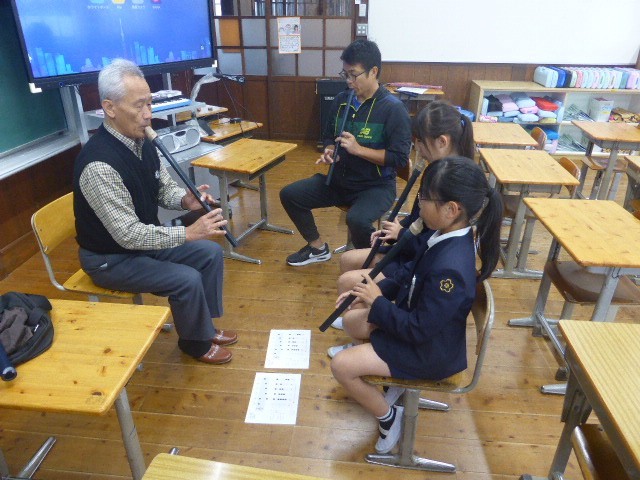 4年生は11月27日(木)「橋っ子音楽祭」に参加し合唱と合奏を披露します。その音楽祭で尺八のプロ演奏家の人と各学校の代表児童が一緒に尺八を吹くという時間があり、本校からも2人の児童が参加します。本日その練習に来ていただきました。とても丁寧に指導いただきました。本番が楽しみです。
