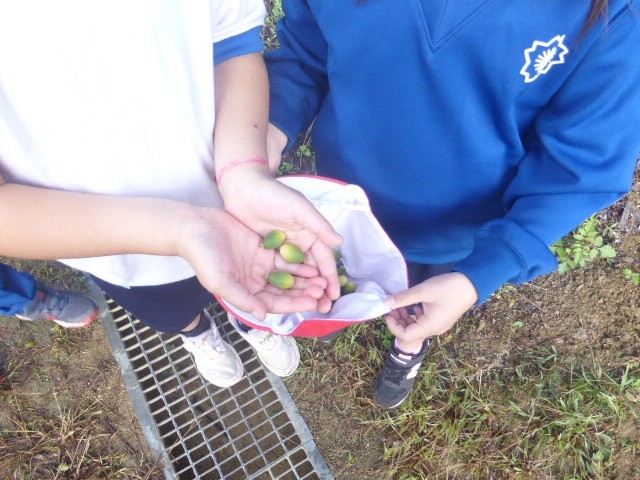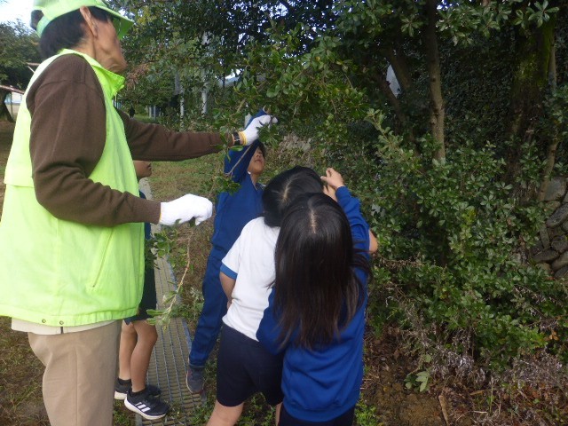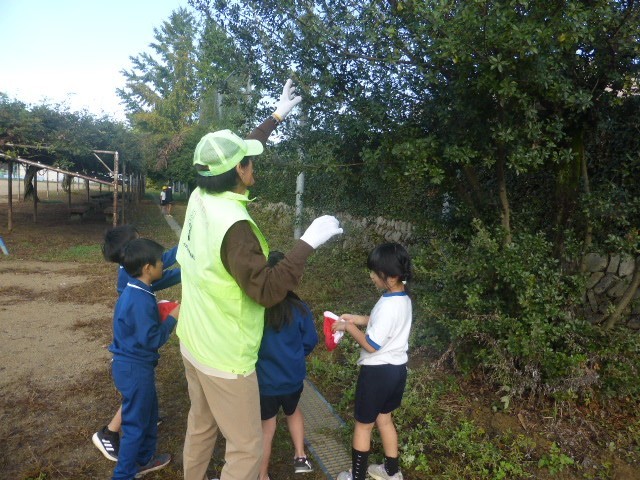 おはようおじさんの方に枝を引っ張ってもらい、ドングリを採っている子どもたちの様子です。まだ青いドングリでしたが喜んでたくさん集めていました。笑顔いっぱいの子どもたちの様子を見ていて、こちらまですごく笑顔になりました。