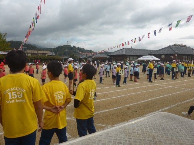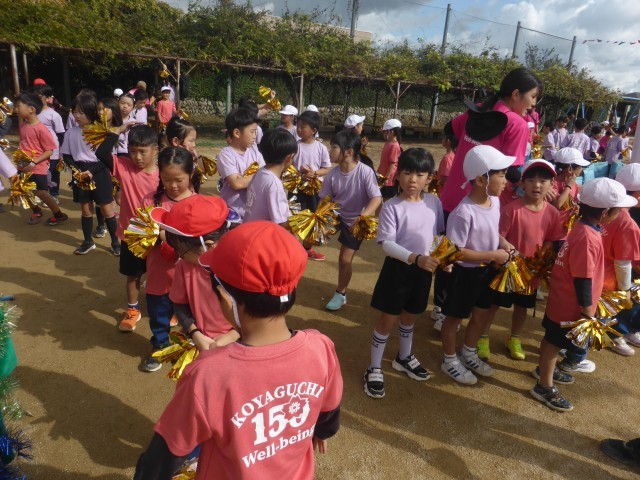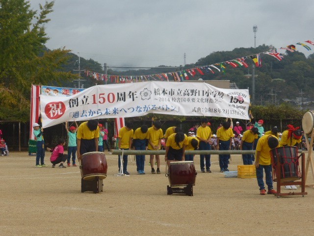 昨夜の雨が嘘のように運動場にも水たまりもなく、150周年記念運動会が予定どおり開催されました。オープニングは6年生児童による150周年記念太鼓です。短い練習時間でしたが、素晴らし太鼓の演奏を聞かせてくれました。各学年違う色の150周年記念Tシャツを着て運動会の始まりです。競技に表現運動に力いっぱいそして笑顔いっぱいの子どもたちの輝く姿をたくさん見ることができました。最後にはみんなで高野口音頭を踊り、150周年記念運動会を終えました。保護者の皆様、地域の皆様、温かいご声援をありがとうございました。