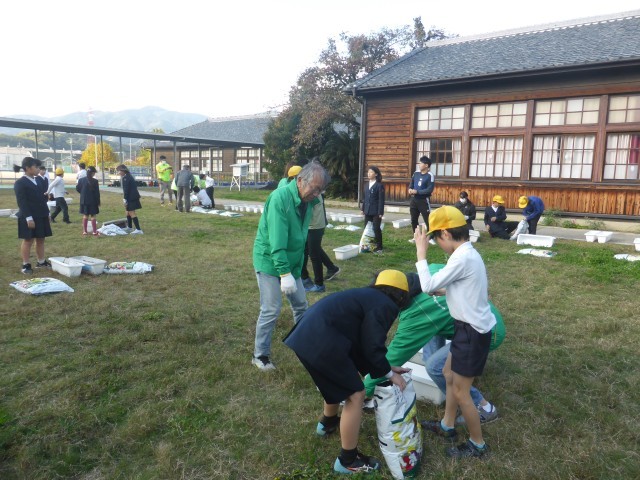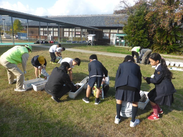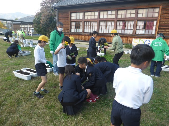 高野口町青少年健全育成会、人権啓発推進委員会、共育コミュニティの共催で本校の花植え交流会が開催されました。本校からは代表委員会と環境委員会が参加し地域の方々と一緒にパンジーやビオラの花をプランターに移植しました。来年の夏まで元気に咲きます。水や肥料をしっかりあげて大切に育ててくださいね。