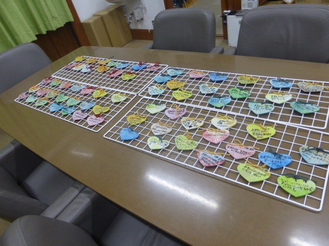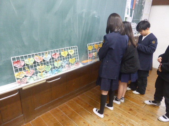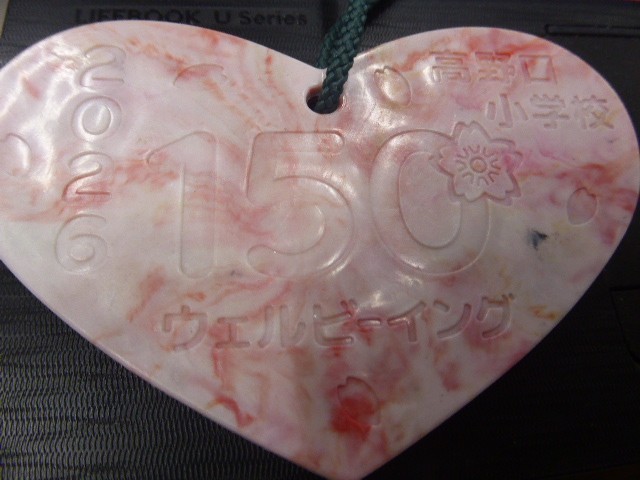 150周年記念式典にペットボトルキャップをリサイクルして作ったハート形の絵馬を飾ります。4Aの子どもたちが各クラスをまわって説明してくれました。高野口や小学校への思いが書かれています。式典当日体育館に飾りますのでぜひご覧ください。