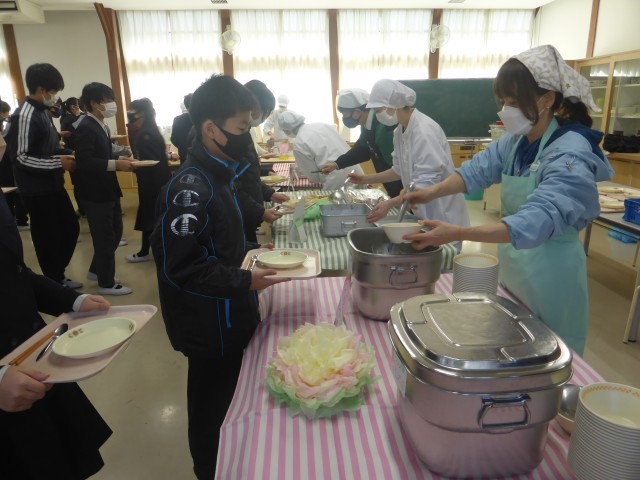 6年生のバイキング給食が行われました。給食センターから栄養士さんたちに来ていただき大変お世話になりました。いつも以上にたくさん食べることができとても喜んでいました。6年間お世話になった給食です。みんなで感謝の気持ちを込めておいしくいただきました。