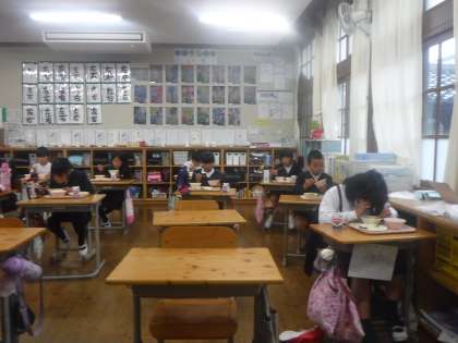今日は4年生A組の給食の時間にお邪魔しました。子どもたちは手を洗い黙って席につき、先生が配膳します。食事中は、誰も話をせず静かに食べていました。