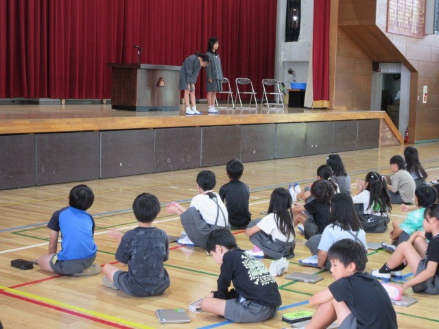 複数の児童が立候補し、どのような学校にしたいかをしっかりと演説して伝えました。