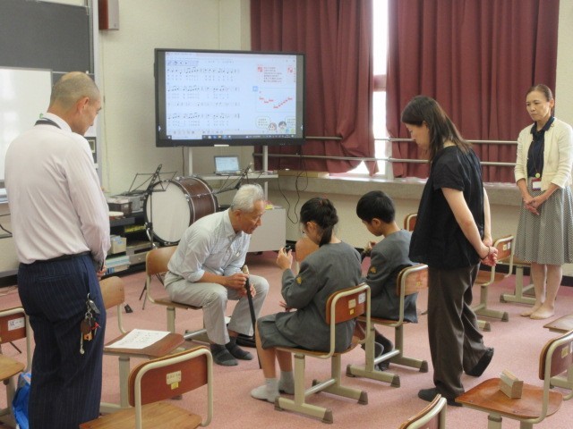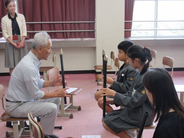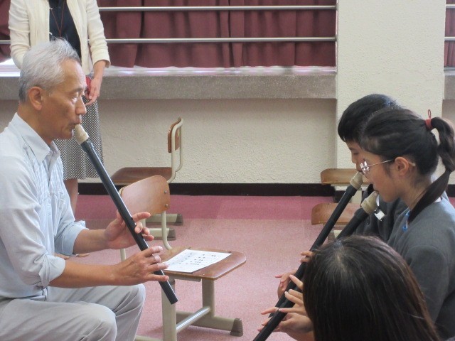 市制20周年記念「橋っ子音楽会」のプログラムに辻本好美さんとミニコンサートのコーナーがあり、そこで応其小学校の代表として2名が参加します。今日は、先生が来てくださり、水道管を使った尺八の練習をしました。