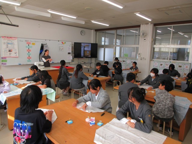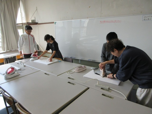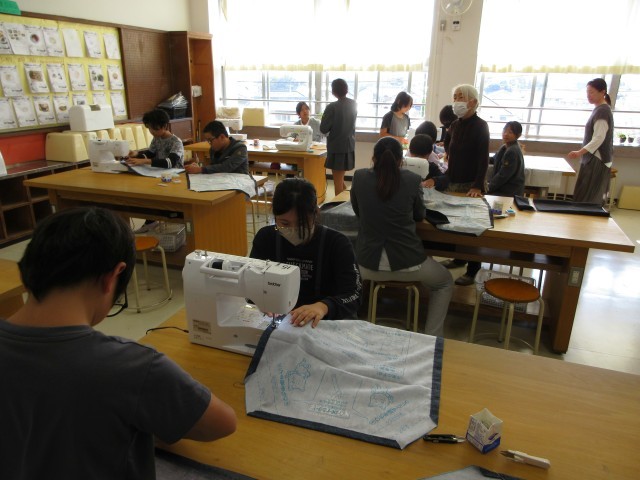 今日はミシンボランティアの方々に来ていただき、授業のサポートをしていただきました。アイロンやミシンの使い方を丁寧に教えていただきました。みなさんのおかげで、スムーズにエプロン作成を進めることができました。ありがとうございました。