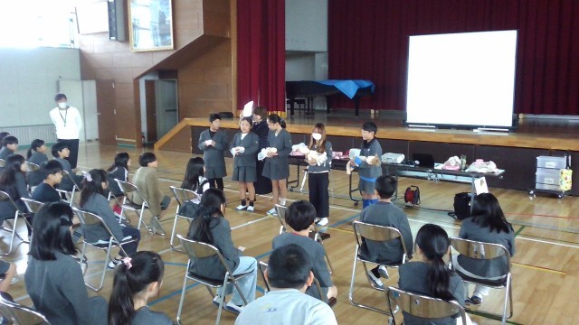 今日は助産師さんに来ていただき、命を育む授業をしていただきました。赤ちゃんがどうやってできるのか、お母さんはどんな思いをしていたのかを教えてくれました。また、子どもたちは休み時間に妊婦さん体験や、赤ちゃんの模型を抱っこする体験、自分の心音を聞いていました。その体験の中で「思っているより重い、かがむのがしんどい、足の爪を切るのが大変、お母さんってすごいなぁ」と感じていました。