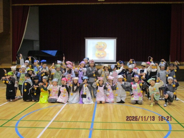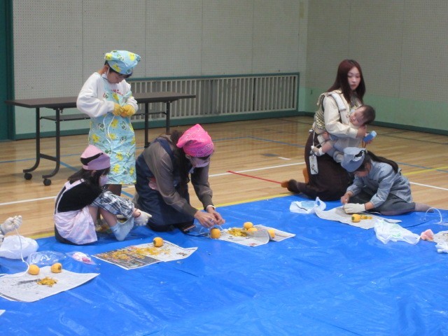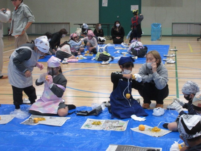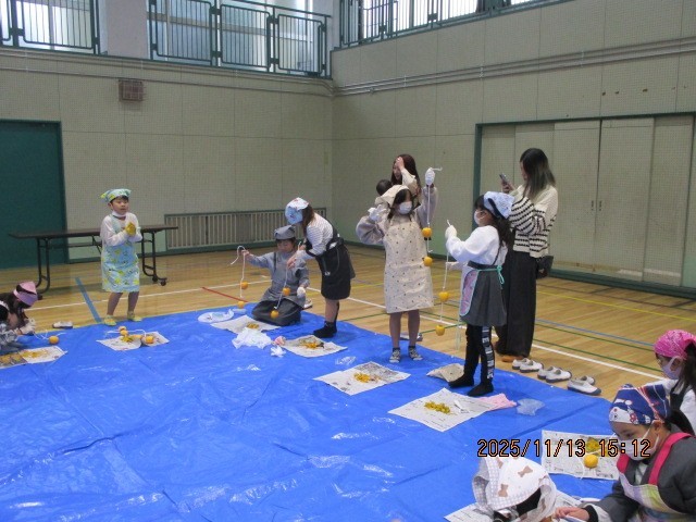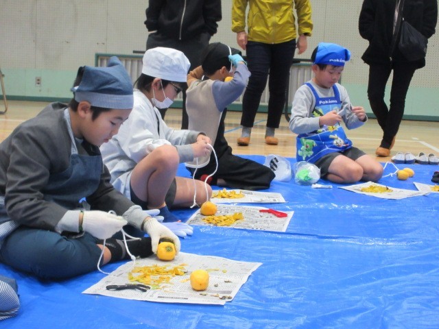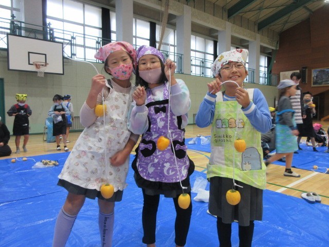 橋本市役所の方とJAの方が来て下さり、吊るし柿づくりを体験させていただきました。子どもたちは慣れないピーラーに戸惑いながらも上手に皮をむき、2つの渋柿を縄につけて完成させました。この吊るし柿はご家庭で乾燥させて、本当の完成になるそうです。風通しの良い軒下などで吊るしていただき、秋の風情を楽しんでいただければと思います。おいしく食べられるといいですね!