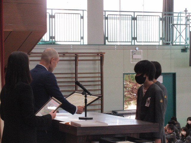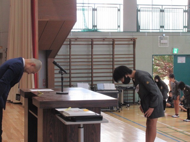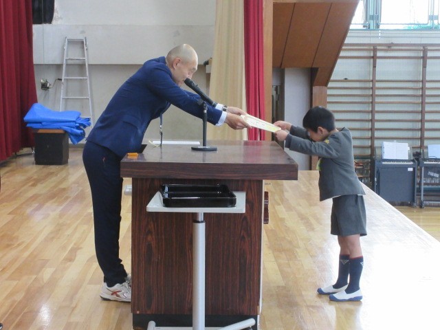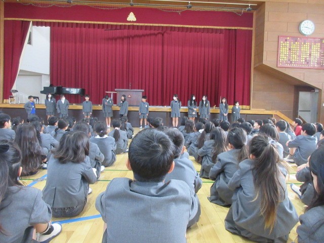 5年生の音楽発表の後は、いつもの集会がありました。校歌と校長先生のお話、新しい先生の紹介、学級委員・委員会の役員の認証や園芸委員会、夏休みの作品の優秀賞などの表彰がありました。