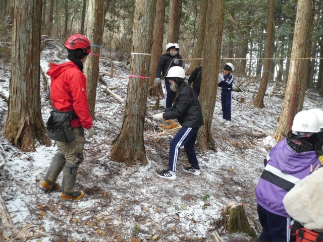 間伐体験では、ノコギリを使って木を切り、ロープの練習もしました。