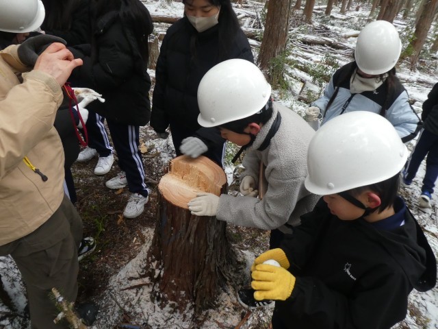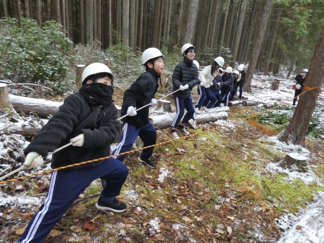 雪がちらつく中、自然観察と間伐体験を行いました。