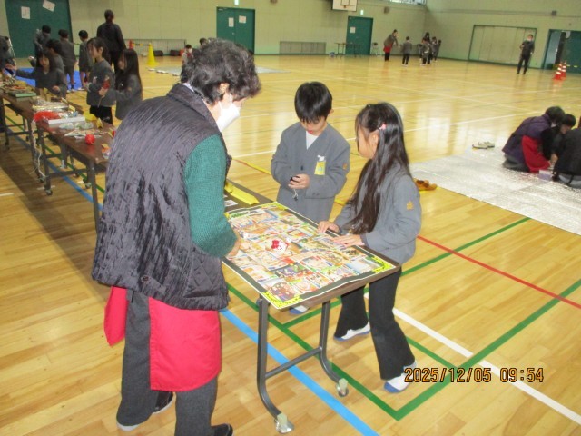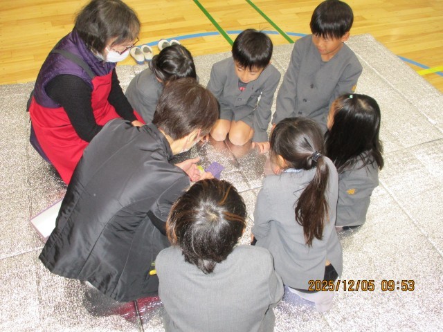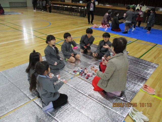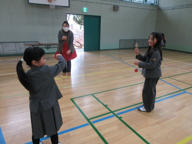 今日は、更生保護女性会のみなさんが昔遊びを教えに来てくれました。けん玉、お手玉、羽根つき、おひめさまめくりなどいろいろなブースをグループに分かれ、回って教えてもらいました。子どもたちは、初めて知った遊びもあったらしく、「これもっとしたい!」ととても楽しそうでした。