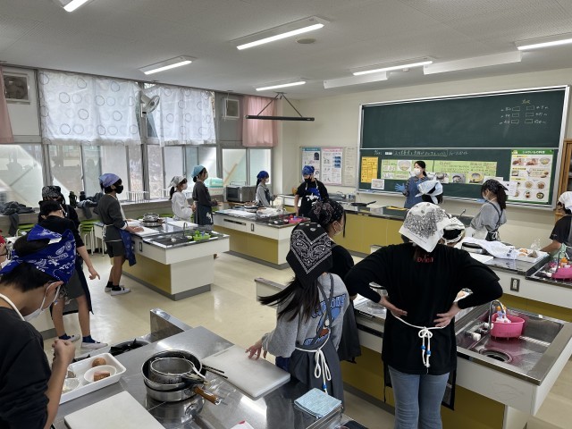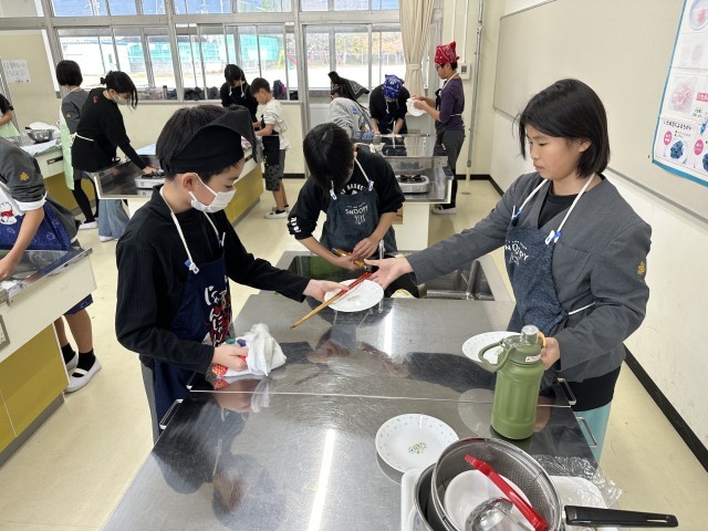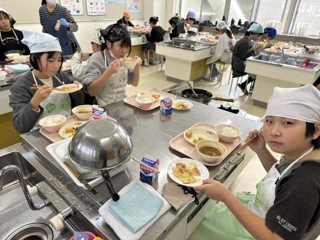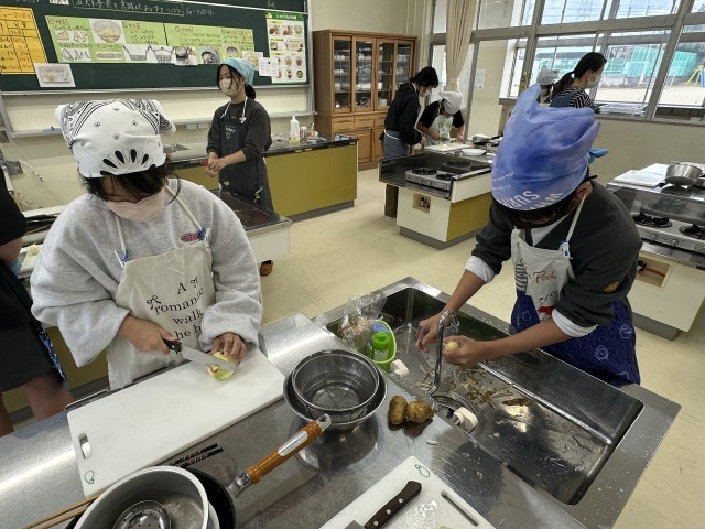 本日、6Aは家庭科の調理実習で「五大栄養素を意識したおかずを作ろう」というめあてで、ジャーマンポテトを作りました。役割分担をしながら、調理を進めていく姿が見られました。フライパンで上手に炒めていたので、おいしく仕上がりました。皿洗いや台拭きなど片付けも班で協力できたと思います。