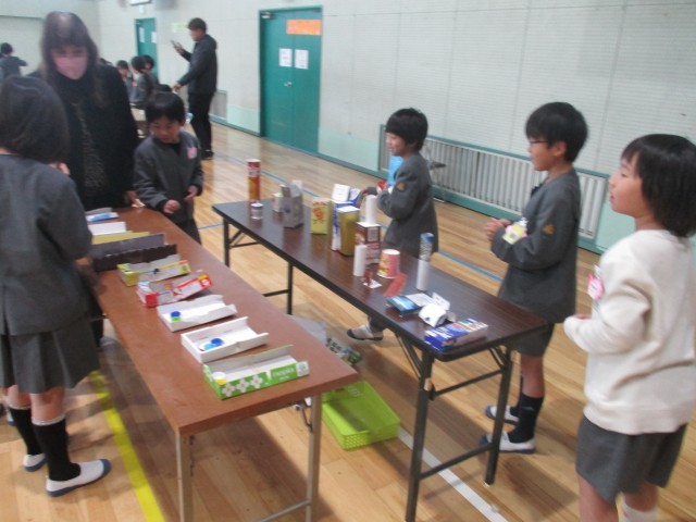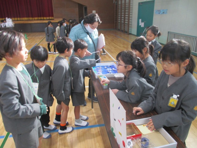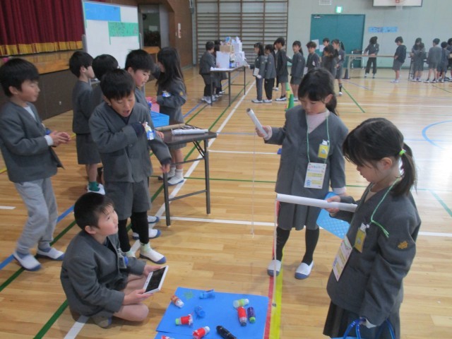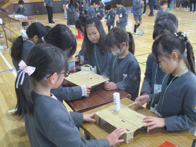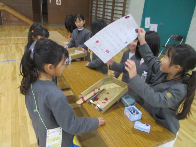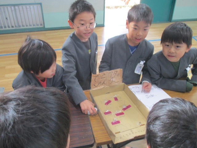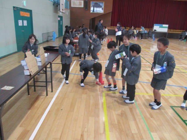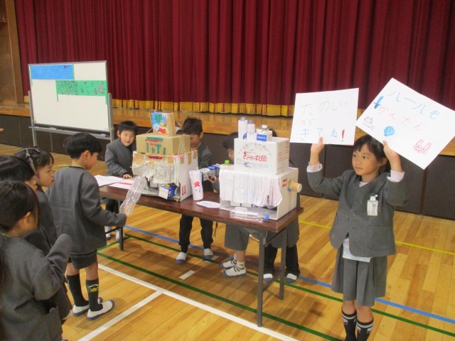 生活科の学習で、1年生に楽しんでもらおうとおもちゃランドに招待しました。自分たちで作ったおもちゃで楽しんでもらえるかドキドキしながら臨んでいました。