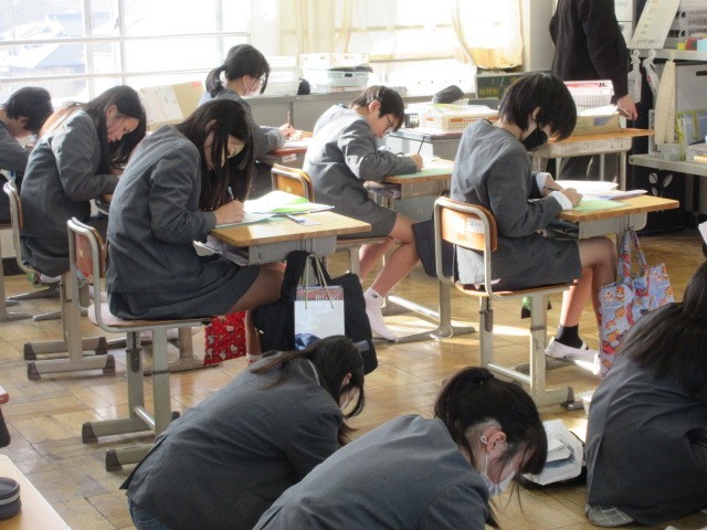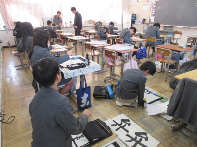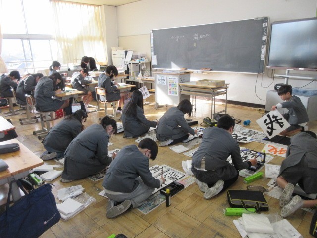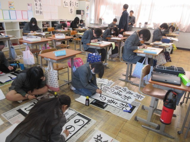 書初会の練習をしています。来週の本番に向けてみんな集中して取り組みました。