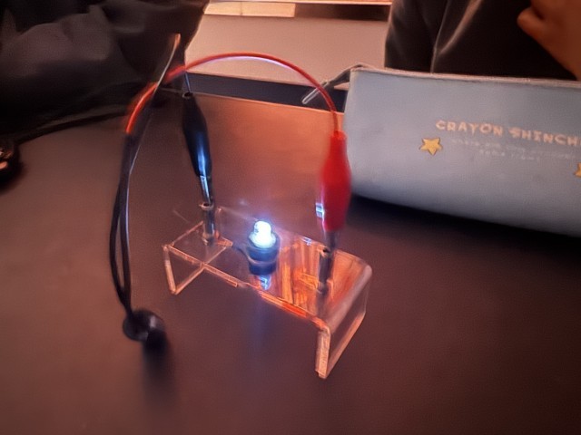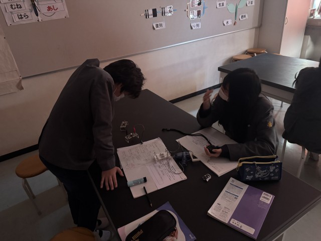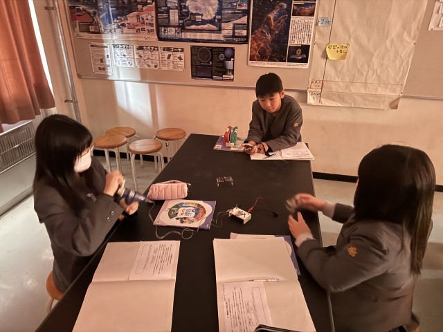 理科の授業では、コンデンサーを用いた実験を行いました。手回し発電機を用い、豆電球や発光ダイオードが何分光るか計測しました。