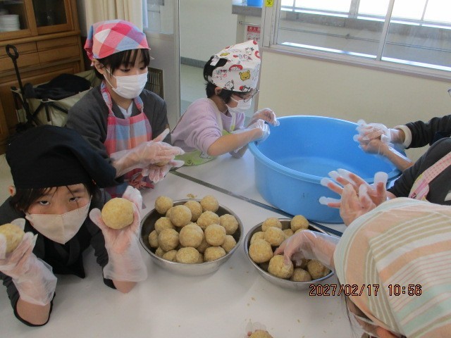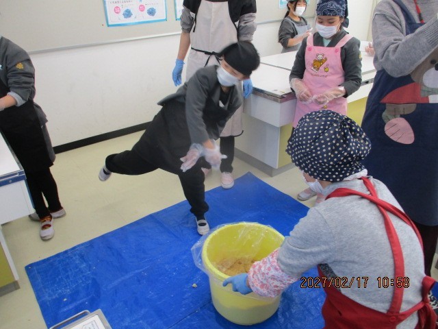 昨日に引き続きみそづくりを行いました。今日は米麴と塩、大豆のミンチを混ぜ合わせ、樽に仕込みました。子どもたちは独特の匂いを感じたり米麹を味見したりして楽しみながら仕込み作業を行いました。美味しいおみそができますように!
