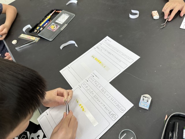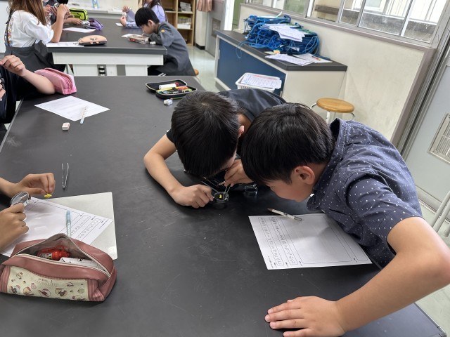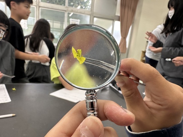 今日は理科の授業で、アラブナの花がどの部分のつくりなのか調べました。ピンセットで花びらやがくを外しながら、花の各部分を虫眼鏡を使って観察することができましたね。