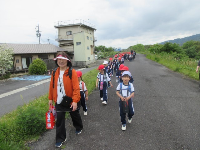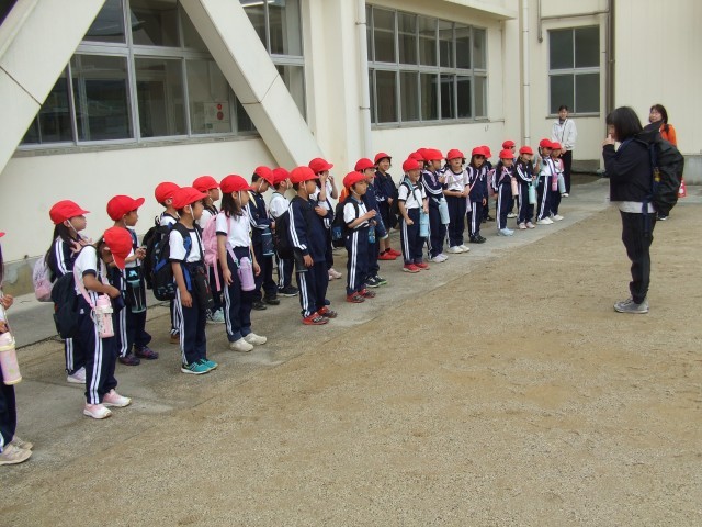 まず、運動場で校長先生のお話を聞き、わくわくしながら学校を出発しました。1年生にとっては、長距離でしたが、がんばって歩くことができました。