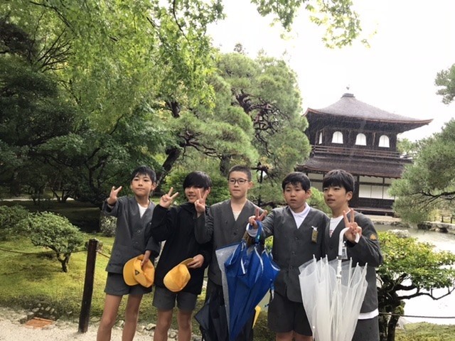 旅館の方に御礼の挨拶を代表の子がして、銀閣寺に向けて出発しました。雨は降っていますが、小雨の時もあります。